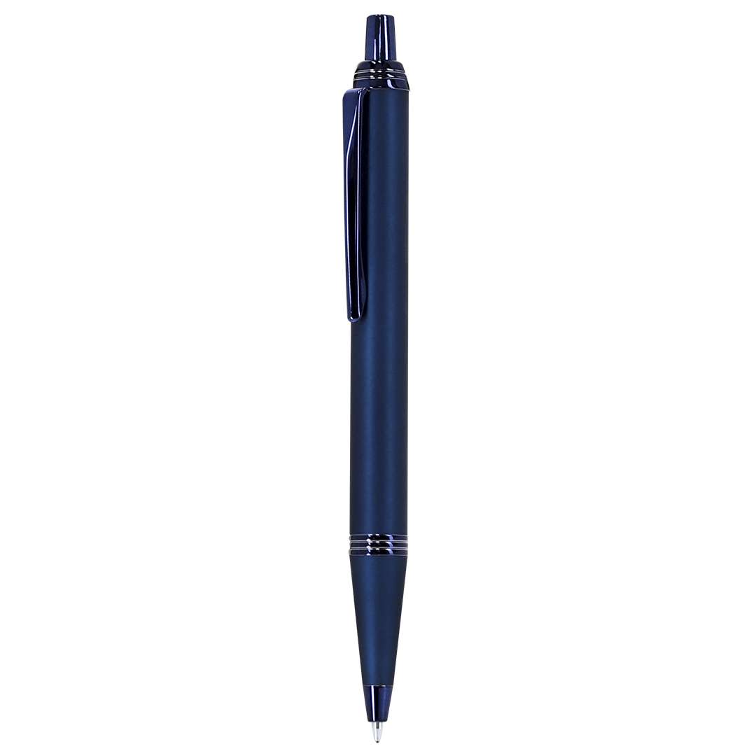 Penna con corpo in alluminio, finitura gommata e dettagli cromati. Meccanismo a pressione, refill jumbo e inchiostro blu.
