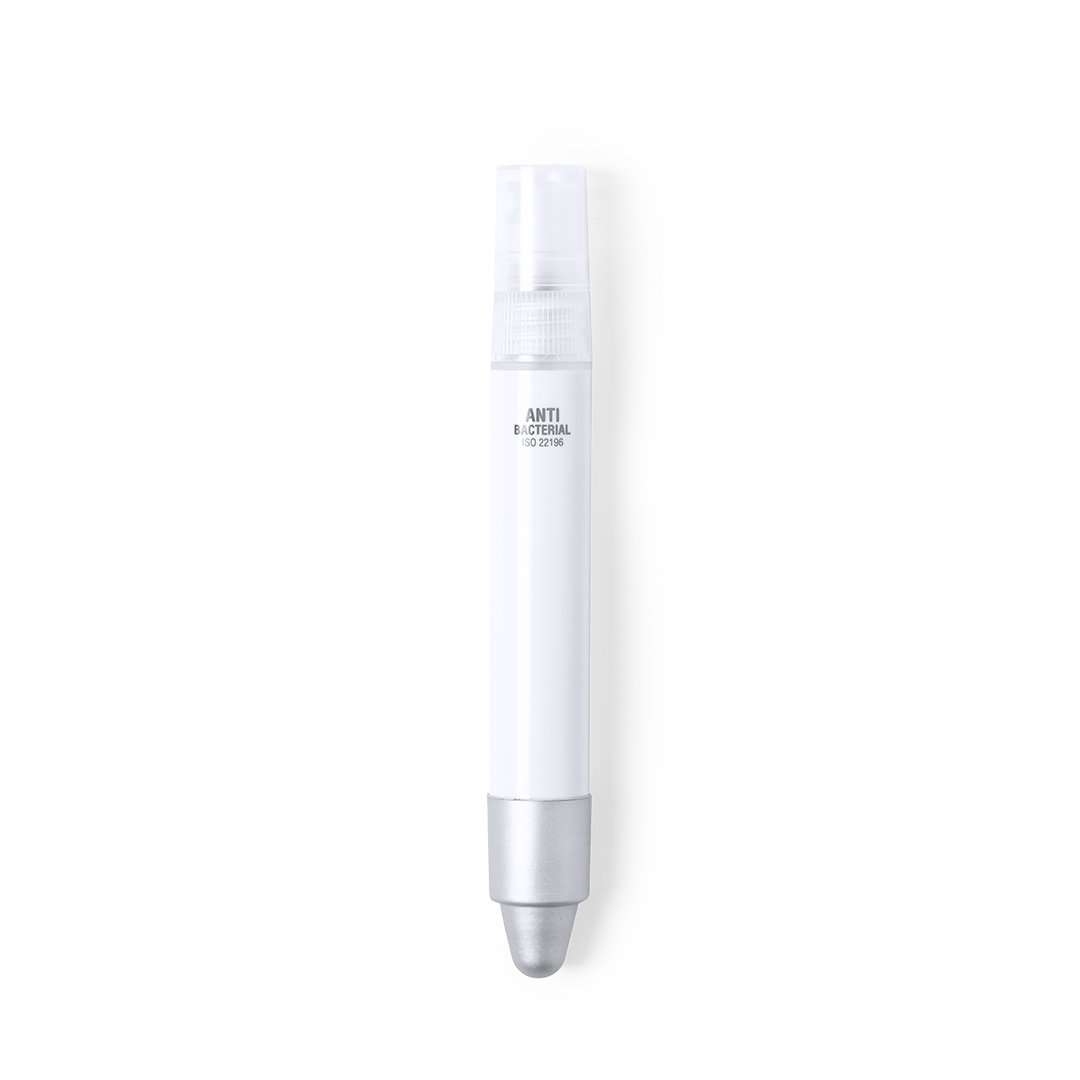Penna antibatterica con spray ricaricabile integrato e cappuccio di protezione dotato di puntatore grigio. Finitura liscia in ABS lucido a lunga durata con dettagli in cromo e refill blu. Capacità spray 3ml. Liquido non incluso.I prodotti con trattamento antibatterico sono in grado di ridurre drasticamente la carica batterica presente sulla superficie dei materiali, grazie alla presenza di agenti microbici statici permanenti, con elevata efficacia nell'inibire e prevenire la contaminazione batterica.Articolo rispondente agli standard ISO 22196, che determina l'attività antibatterica nei materiali plastici e nelle superfici non porose e di conoscere l'efficacia dell'inibizione microbica che gli additivi hanno sugli oggetti trattati attraverso una valutazione quantitativa