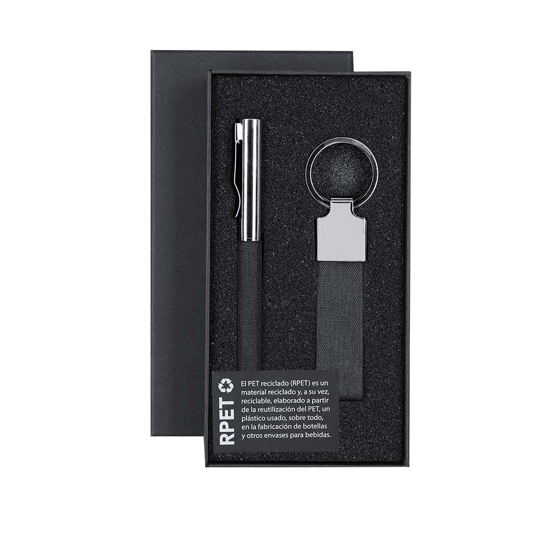 Elegante set in RPET con finitura nera bicolore e dettagli metallici. Include:-Penna a sfera in RPET di finitura nera bicolore e dettagli metallici. Con meccanismo girevole e inchiostro blu.-Portachiavi in RPET di finitura color nero bicolore e accessori cromati.Presentato in astuccio individuale nero. Include scheda nera interna con distintivo RPET.Il materiale RPET è realizzato a partire da plastica riciclata, per promuovere il riutilizzo dei rifiuti plastici e aiutare la sostenibilità del pianeta.