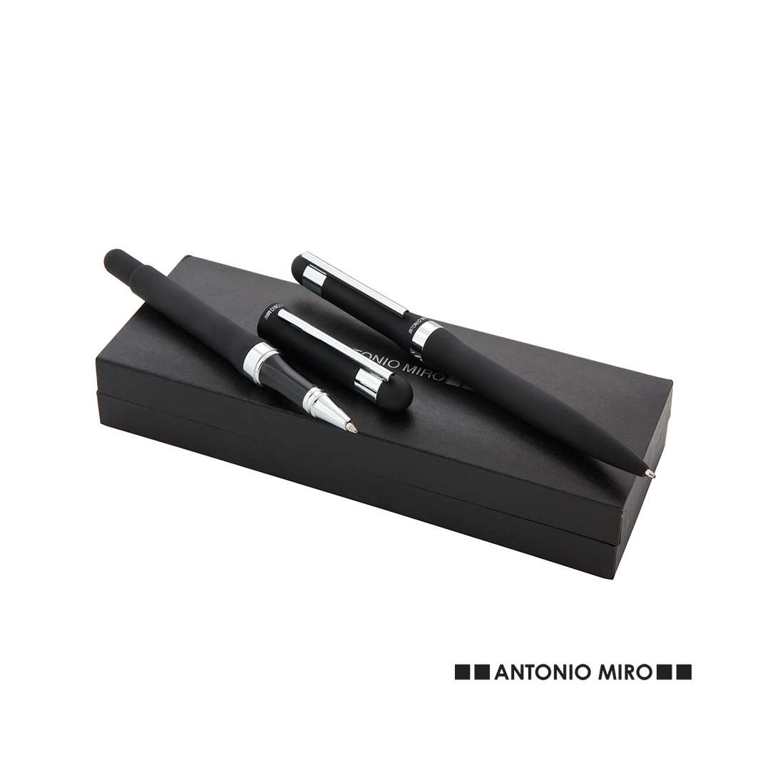 Elegante set by Antonio Miró con penna con meccanismo a rotazione e penna roller con cappuccio e originale anello dal design sobrio. Corpo metallico con finitura nera lucida e clip argentata. Presentato in un elegante astuccio nero con logo del marchio e custodia. Inchiostro blu.