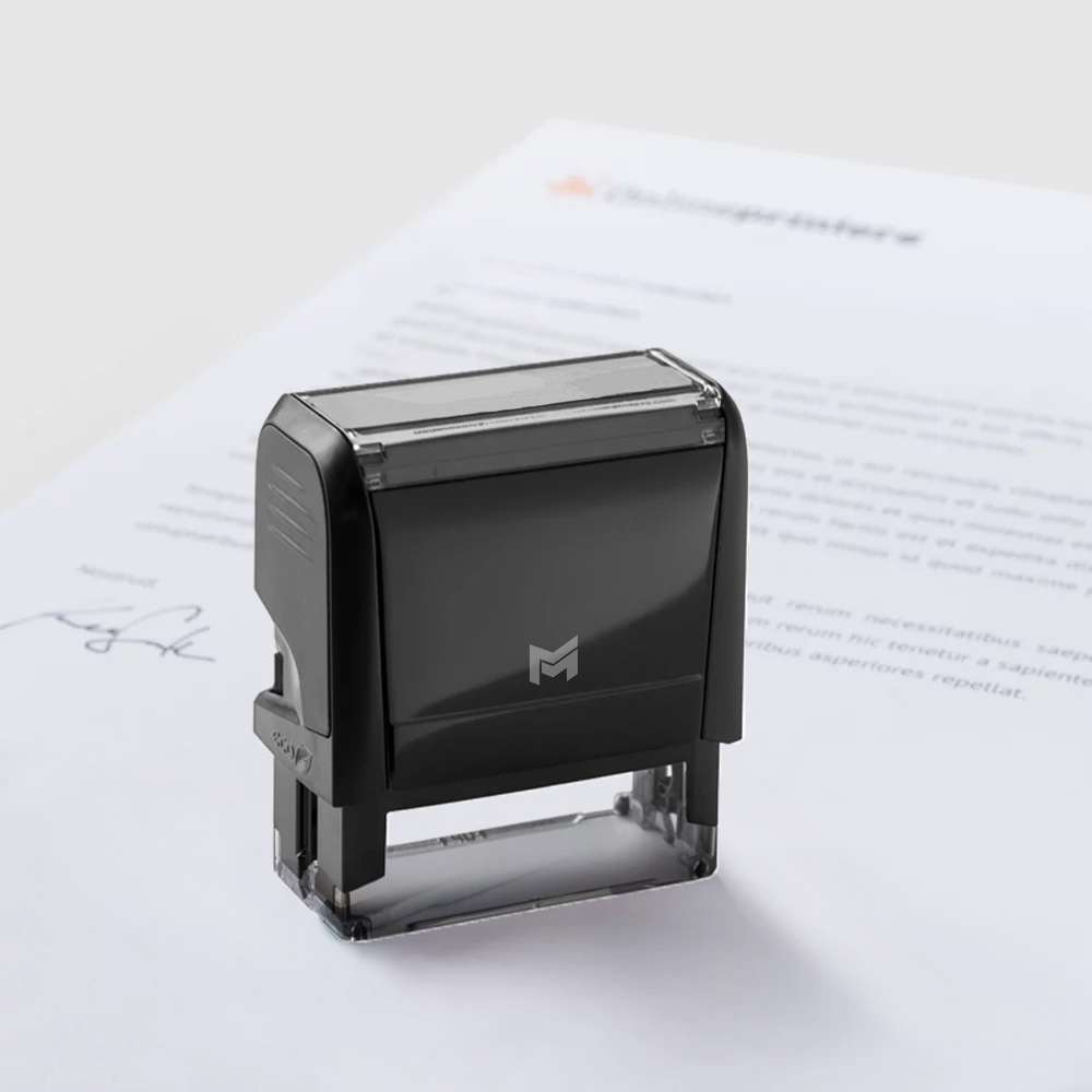 La piastra del timbro in gomma lascia spazio sufficiente per scrivere un testo con 6 righe. Il nome e l'indirizzo dell'azienda possono essere integrati con uno slogan, un indirizzo e-mail e il sito Web dell'azienda. La forma generosa della piastra per timbri in gomma consente l'integrazione di un elemento grafico come parte dell'individualizzazione. Per personalizzare il tuo timbro, usa il nostro Editor online. Sono disponibili grafica, caratteri fantasiosi e modelli di design e persino un design esistente può essere caricato.
